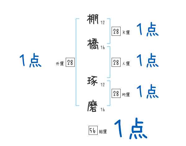 天運![]() | 棚橋琢磨さんの天運は28画の1つ星!家庭環境に注意。スポーツで活躍できる能力があるかも。 家系が持つ宿命的な運勢を表します。祖先から受け継いだ苗字ですので自分の力が及びません。家柄を象徴します。 |
