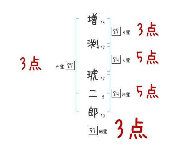 総運![]() | 増渕琥二郎さんの総運は51画の3つ星!変化が激しく、危険に注意。堅実な性格。 あなたの人生を表す1番重要な運勢です。生涯を通じて影響する総合運となり、主に50歳以降の晩年期に影響を及ぼします。 |