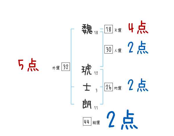 外運![]() | 魏琥士朗さんの外運は32画の5つ星!柔軟性があり成功する。チャンスが多く金運が良い。 生活面を象徴する運勢です。外部から受ける影響力を表し、結婚運、家庭運や職場、環境への順応性を表します。 |