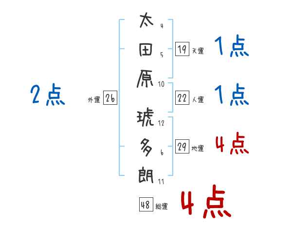 外運![]() | 太田原琥多朗さんの外運は26画の2つ星!波瀾万丈かも。信頼できる人を大事にしましょう。 生活面を象徴する運勢です。外部から受ける影響力を表し、結婚運、家庭運や職場、環境への順応性を表します。 |