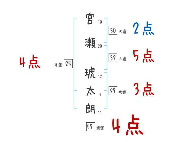 人運![]() | 宮瀬琥太朗さんの人運は32画の5つ星!柔軟性があり成功する。チャンスが多く金運が良い。 性格や才能などを表す2番目に重要な運勢です。人間関係や協調性、社会的な成功に影響します。主に20歳から50歳ぐらいまでの中年期の運勢を表します。 |