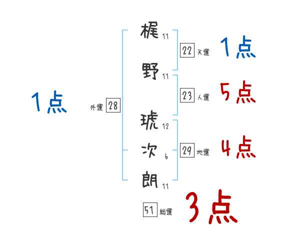 総運![]() | 梶野琥次朗さんの総運は51画の3つ星!変化が激しく、危険に注意。堅実な性格。 あなたの人生を表す1番重要な運勢です。生涯を通じて影響する総合運となり、主に50歳以降の晩年期に影響を及ぼします。 |