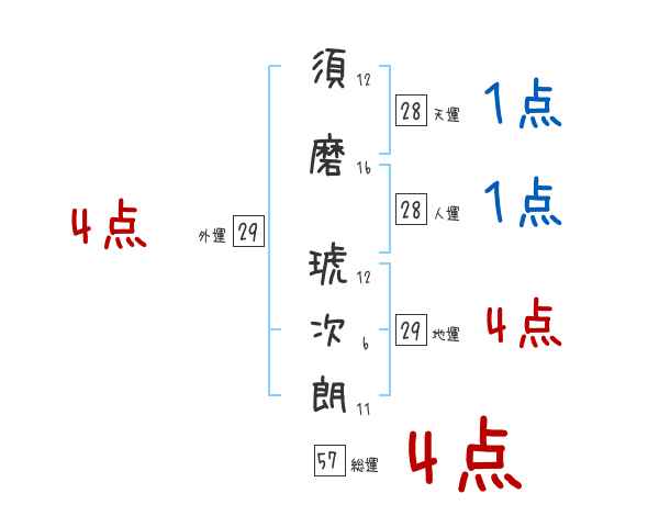 天運![]() | 須磨琥次朗さんの天運は28画の1つ星!家庭環境に注意。スポーツで活躍できる能力があるかも。 家系が持つ宿命的な運勢を表します。祖先から受け継いだ苗字ですので自分の力が及びません。家柄を象徴します。 |