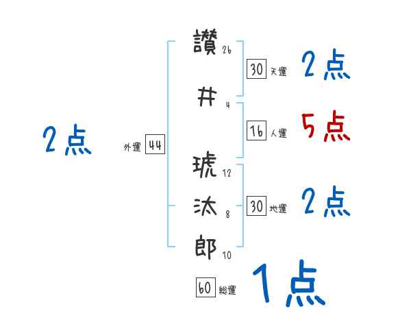 天運![]() | 讃井琥汰郎さんの天運は30画の2つ星!浮き沈みの激しさに注意しましょう。 家系が持つ宿命的な運勢を表します。祖先から受け継いだ苗字ですので自分の力が及びません。家柄を象徴します。 |