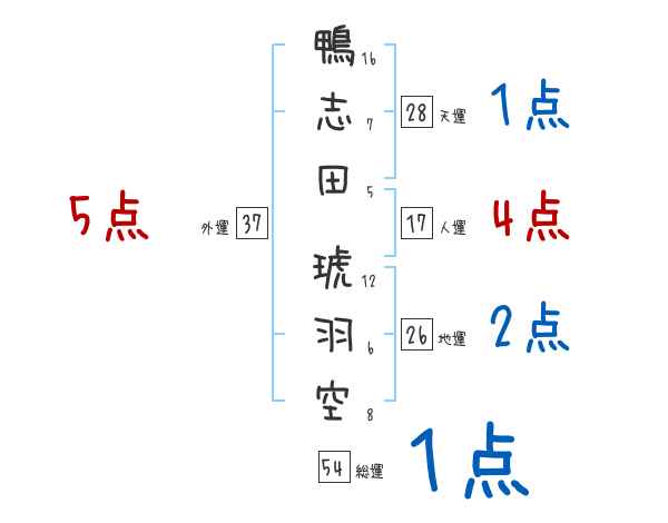 天運![]() | 鴨志田琥羽空さんの天運は28画の1つ星!家庭環境に注意。スポーツで活躍できる能力があるかも。 家系が持つ宿命的な運勢を表します。祖先から受け継いだ苗字ですので自分の力が及びません。家柄を象徴します。 |