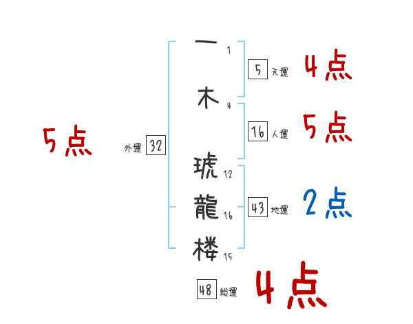 天運![]() | 一木琥龍楼さんの天運は5画の4つ星!健康で安泰。協調性に優れ、財産に恵まれる。 家系が持つ宿命的な運勢を表します。祖先から受け継いだ苗字ですので自分の力が及びません。家柄を象徴します。 |