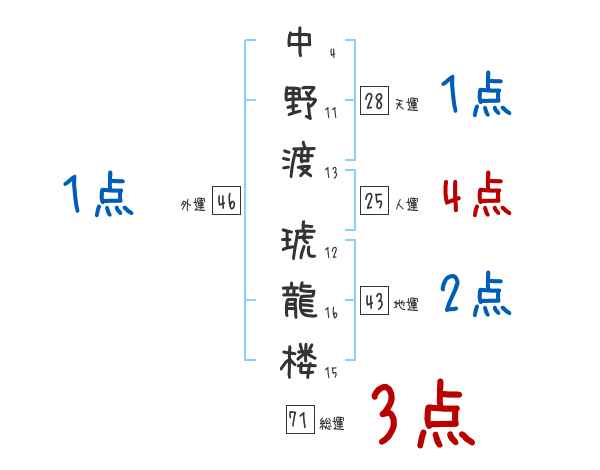 天運![]() | 中野渡琥龍楼さんの天運は28画の1つ星!家庭環境に注意。スポーツで活躍できる能力があるかも。 家系が持つ宿命的な運勢を表します。祖先から受け継いだ苗字ですので自分の力が及びません。家柄を象徴します。 |