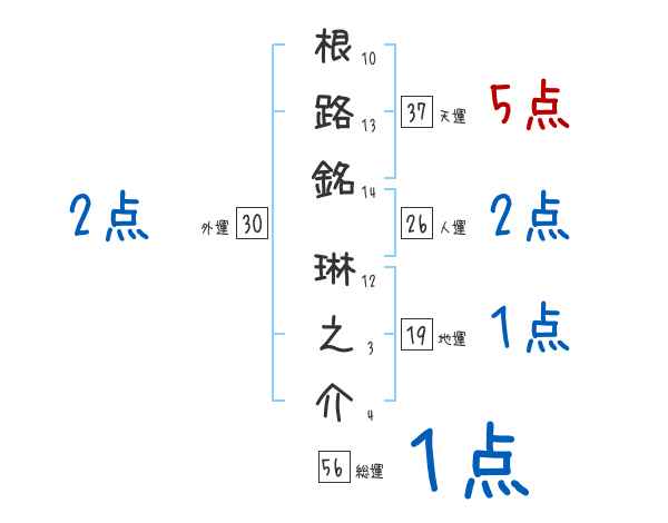 外運![]() | 根路銘琳之介さんの外運は30画の2つ星!浮き沈みの激しさに注意しましょう。 生活面を象徴する運勢です。外部から受ける影響力を表し、結婚運、家庭運や職場、環境への順応性を表します。 |