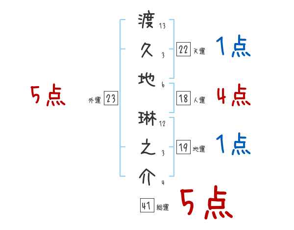 天運![]() | 渡久地琳之介さんの天運は22画の1つ星!努力することが苦手ないっぽう手先が器用。芸術性にも優れる。 家系が持つ宿命的な運勢を表します。祖先から受け継いだ苗字ですので自分の力が及びません。家柄を象徴します。 |