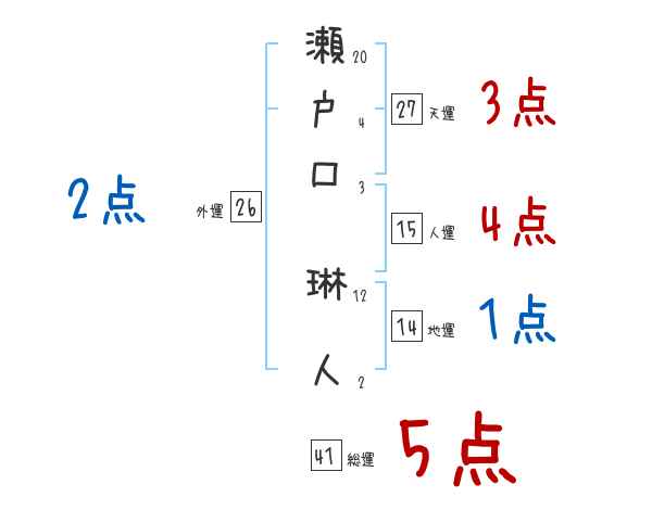 天運![]() | 瀬戸口琳人さんの天運は27画の3つ星!頭脳明晰だが強情で摩擦が多い傾向。孤立に注意。 家系が持つ宿命的な運勢を表します。祖先から受け継いだ苗字ですので自分の力が及びません。家柄を象徴します。 |