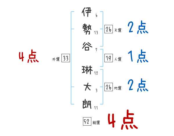 外運![]() | 伊勢谷琳大朗さんの外運は33画の4つ星!権力志向でプライドが高い。勇気があり運を切り開き成功する。 生活面を象徴する運勢です。外部から受ける影響力を表し、結婚運、家庭運や職場、環境への順応性を表します。 |