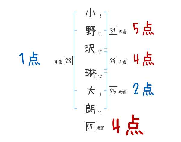 総運![]() | 小野沢琳大朗さんの総運は57画の4つ星!向上心があり人望がある。地位を得る。 あなたの人生を表す1番重要な運勢です。生涯を通じて影響する総合運となり、主に50歳以降の晩年期に影響を及ぼします。 |