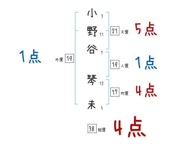 外運![]() | 小野谷琴未さんの外運は19画の1つ星!優れた才能を持ちますが、協調性が足りないことも。周りの人と協力する事を意識しましょう。 生活面を象徴する運勢です。外部から受ける影響力を表し、結婚運、家庭運や職場、環境への順応性を表します。 |