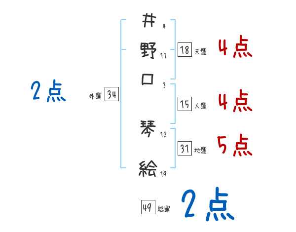 天運![]() | 井野口琴絵さんの天運は18画の4つ星!情熱的で剛気。忍耐力があり信頼される。 家系が持つ宿命的な運勢を表します。祖先から受け継いだ苗字ですので自分の力が及びません。家柄を象徴します。 |