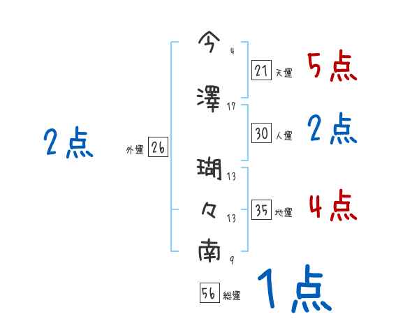 総運![]() | 今澤瑚々南さんの総運は56画の1つ星!消極的で無気力になりがち。誠実な気持ちが必要でしょう。 あなたの人生を表す1番重要な運勢です。生涯を通じて影響する総合運となり、主に50歳以降の晩年期に影響を及ぼします。 |