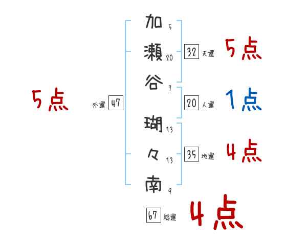 外運![]() | 加瀬谷瑚々南さんの外運は47画の5つ星!実力が開花し発展する円満な人生。財に恵まれる。 生活面を象徴する運勢です。外部から受ける影響力を表し、結婚運、家庭運や職場、環境への順応性を表します。 |