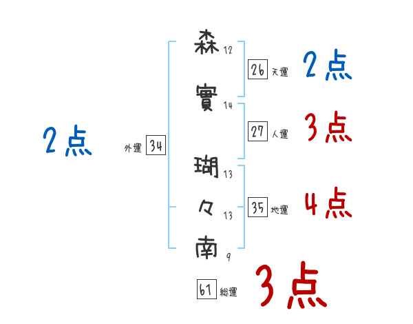 人運![]() | 森實瑚々南さんの人運は27画の3つ星!頭脳明晰だが強情で摩擦が多い傾向。孤立に注意。 性格や才能などを表す2番目に重要な運勢です。人間関係や協調性、社会的な成功に影響します。主に20歳から50歳ぐらいまでの中年期の運勢を表します。 |