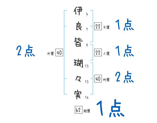 人運![]() | 伊良皆瑚々実さんの人運は22画の1つ星!努力することが苦手ないっぽう手先が器用。芸術性にも優れる。 性格や才能などを表す2番目に重要な運勢です。人間関係や協調性、社会的な成功に影響します。主に20歳から50歳ぐらいまでの中年期の運勢を表します。 |
