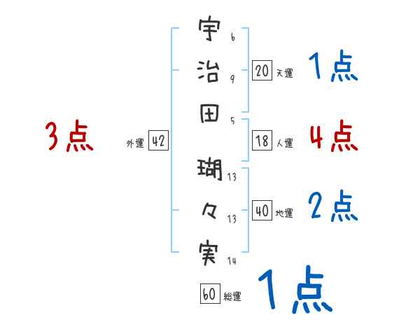 外運![]() | 宇治田瑚々実さんの外運は42画の3つ星!病気に注意。多芸であるが消極的でおとなしい。 生活面を象徴する運勢です。外部から受ける影響力を表し、結婚運、家庭運や職場、環境への順応性を表します。 |