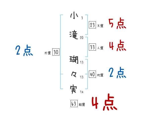 人運![]() | 小滝瑚々実さんの人運は33画の4つ星!権力志向でプライドが高い。勇気があり運を切り開き成功する。 性格や才能などを表す2番目に重要な運勢です。人間関係や協調性、社会的な成功に影響します。主に20歳から50歳ぐらいまでの中年期の運勢を表します。 |