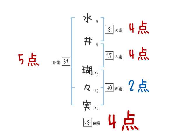 天運![]() | 水井瑚々実さんの天運は8画の4つ星!勤勉家。根気強く努力し成功する。忍耐力がある。 家系が持つ宿命的な運勢を表します。祖先から受け継いだ苗字ですので自分の力が及びません。家柄を象徴します。 |