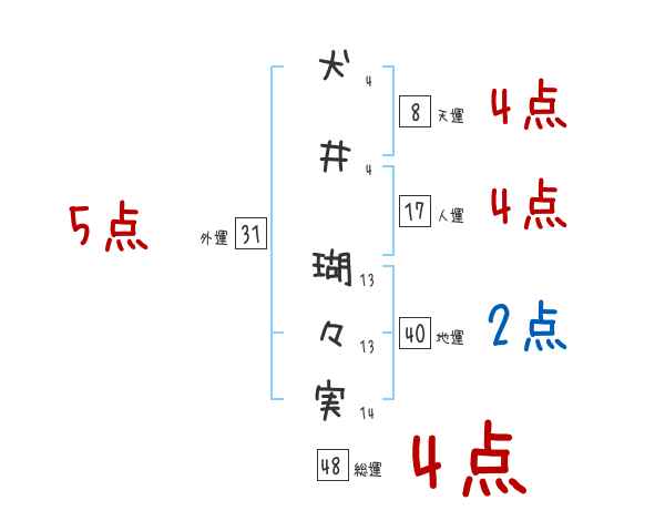 総運![]() | 犬井瑚々実さんの総運は48画の4つ星!賢明な性格で人望が厚い。指導力があり多くの人に尊敬される。 あなたの人生を表す1番重要な運勢です。生涯を通じて影響する総合運となり、主に50歳以降の晩年期に影響を及ぼします。 |