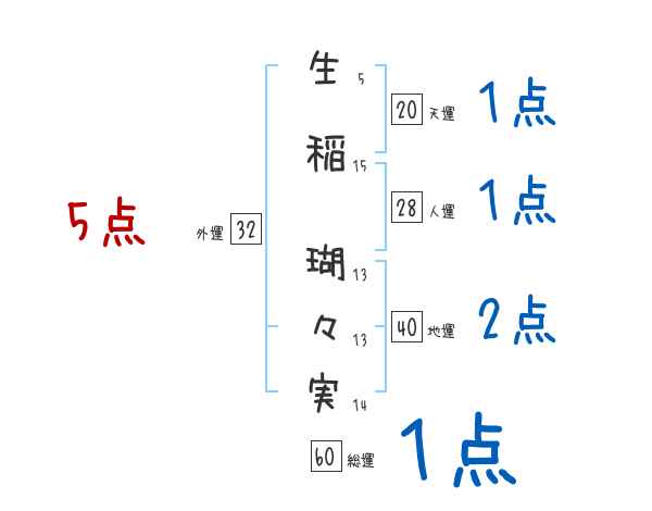 外運![]() | 生稲瑚々実さんの外運は32画の5つ星!柔軟性があり成功する。チャンスが多く金運が良い。 生活面を象徴する運勢です。外部から受ける影響力を表し、結婚運、家庭運や職場、環境への順応性を表します。 |