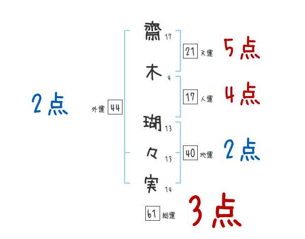 外運![]() | 齋木瑚々実さんの外運は44画の2つ星!誠実で慎重な性格。物事を考えすぎないように注意しましょう。 生活面を象徴する運勢です。外部から受ける影響力を表し、結婚運、家庭運や職場、環境への順応性を表します。 |