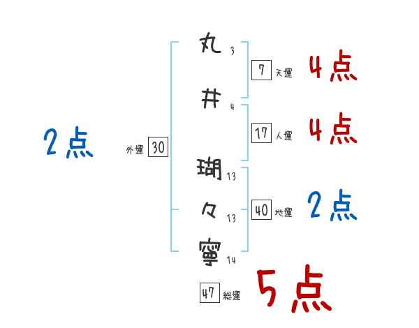 天運![]() | 丸井瑚々寧さんの天運は7画の4つ星!強い意志や信念を持ち独立心が強い。自立する。 家系が持つ宿命的な運勢を表します。祖先から受け継いだ苗字ですので自分の力が及びません。家柄を象徴します。 |