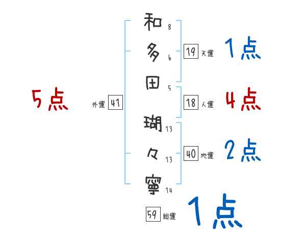 天運![]() | 和多田瑚々寧さんの天運は19画の1つ星!優れた才能を持ちますが、協調性が足りないことも。周りの人と協力する事を意識しましょう。 家系が持つ宿命的な運勢を表します。祖先から受け継いだ苗字ですので自分の力が及びません。家柄を象徴します。 |