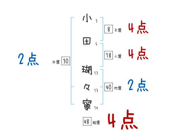 外運![]() | 小田瑚々寧さんの外運は30画の2つ星!浮き沈みの激しさに注意しましょう。 生活面を象徴する運勢です。外部から受ける影響力を表し、結婚運、家庭運や職場、環境への順応性を表します。 |