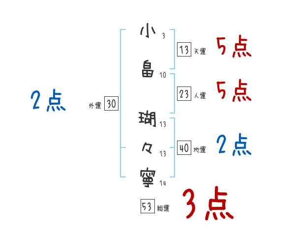 総運![]() | 小畠瑚々寧さんの総運は53画の3つ星!やや見栄っ張りで虚栄心がある。散財に注意。 あなたの人生を表す1番重要な運勢です。生涯を通じて影響する総合運となり、主に50歳以降の晩年期に影響を及ぼします。 |