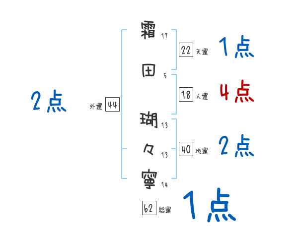 外運![]() | 霜田瑚々寧さんの外運は44画の2つ星!誠実で慎重な性格。物事を考えすぎないように注意しましょう。 生活面を象徴する運勢です。外部から受ける影響力を表し、結婚運、家庭運や職場、環境への順応性を表します。 |