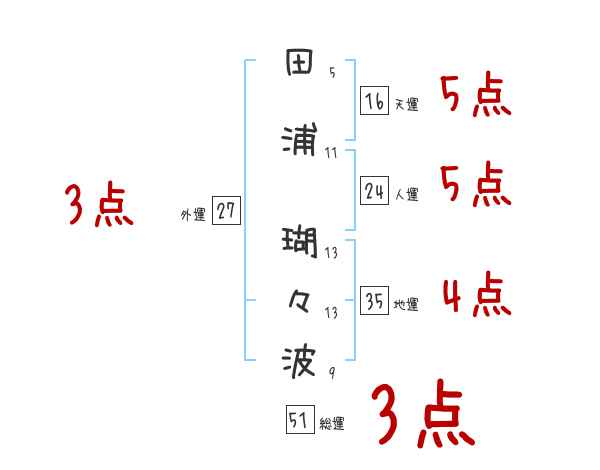 天運![]() | 田浦瑚々波さんの天運は16画の5つ星!人望が厚く大きく発展する。逆転成功が見える。 家系が持つ宿命的な運勢を表します。祖先から受け継いだ苗字ですので自分の力が及びません。家柄を象徴します。 |