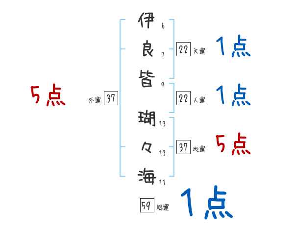 地運![]() | 伊良皆瑚々海さんの地運は37画の5つ星!努力家で順応性に優れる。現実的な考え方ができ忠実に物事をこなす。 個性を表す基礎的な運勢です。性格形成や対人関係、行動力など家庭環境に影響されます。主に誕生してから20歳くらいまでの若年期の運勢を表します。 |