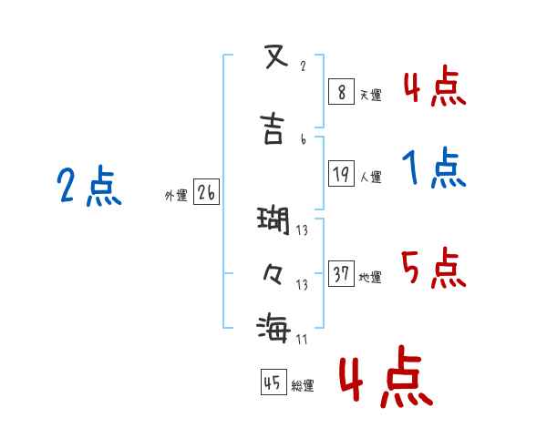 天運![]() | 又吉瑚々海さんの天運は8画の4つ星!勤勉家。根気強く努力し成功する。忍耐力がある。 家系が持つ宿命的な運勢を表します。祖先から受け継いだ苗字ですので自分の力が及びません。家柄を象徴します。 |