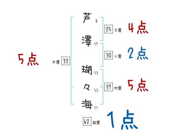 外運![]() | 芦澤瑚々海さんの外運は32画の5つ星!柔軟性があり成功する。チャンスが多く金運が良い。 生活面を象徴する運勢です。外部から受ける影響力を表し、結婚運、家庭運や職場、環境への順応性を表します。 |