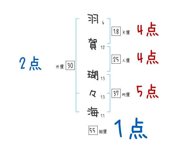 天運![]() | 羽賀瑚々海さんの天運は18画の4つ星!情熱的で剛気。忍耐力があり信頼される。 家系が持つ宿命的な運勢を表します。祖先から受け継いだ苗字ですので自分の力が及びません。家柄を象徴します。 |