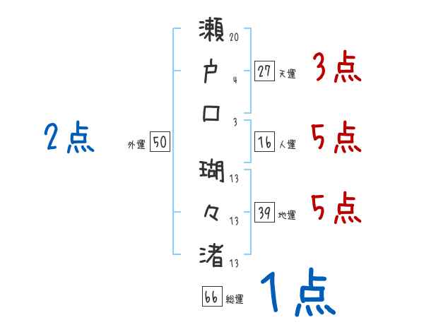 瀬戸口瑚々渚さんの画数の鑑定結果