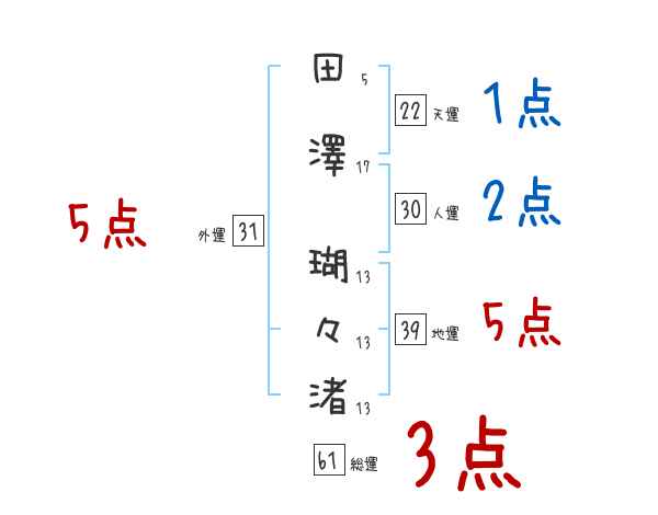 総運![]() | 田澤瑚々渚さんの総運は61画の3つ星!強情な性格でうぬぼれタイプ。自ら破滅する。 あなたの人生を表す1番重要な運勢です。生涯を通じて影響する総合運となり、主に50歳以降の晩年期に影響を及ぼします。 |