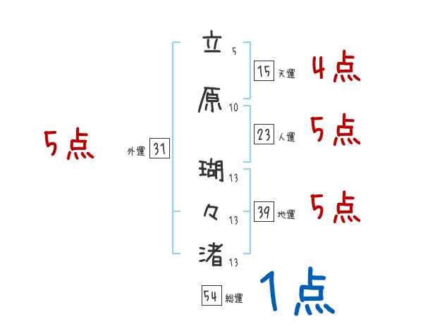 天運![]() | 立原瑚々渚さんの天運は15画の4つ星!人徳があり出世する。順調に物事を進め円満な人生。 家系が持つ宿命的な運勢を表します。祖先から受け継いだ苗字ですので自分の力が及びません。家柄を象徴します。 |