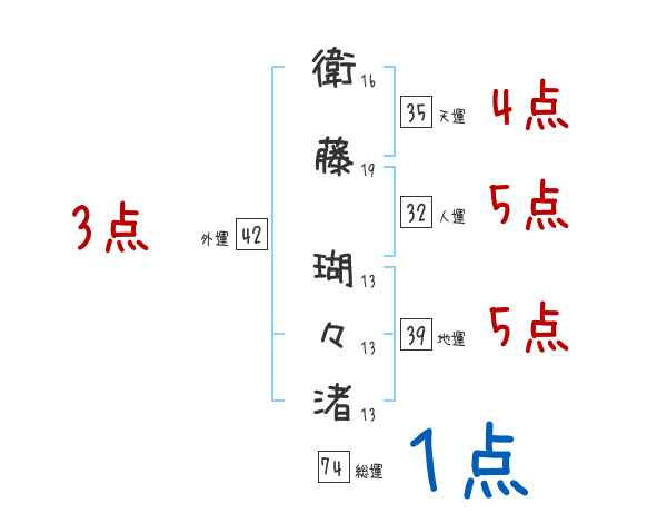 天運![]() | 衛藤瑚々渚さんの天運は35画の4つ星!温厚な性格で感受性が高い。穏和な性格で人望が厚い。 家系が持つ宿命的な運勢を表します。祖先から受け継いだ苗字ですので自分の力が及びません。家柄を象徴します。 |