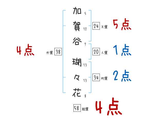 総運![]() | 加賀谷瑚々花さんの総運は58画の4つ星!安定した生活。大器晩成タイプ。 あなたの人生を表す1番重要な運勢です。生涯を通じて影響する総合運となり、主に50歳以降の晩年期に影響を及ぼします。 |