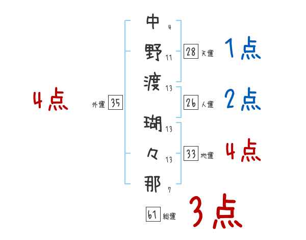 天運![]() | 中野渡瑚々那さんの天運は28画の1つ星!家庭環境に注意。スポーツで活躍できる能力があるかも。 家系が持つ宿命的な運勢を表します。祖先から受け継いだ苗字ですので自分の力が及びません。家柄を象徴します。 |