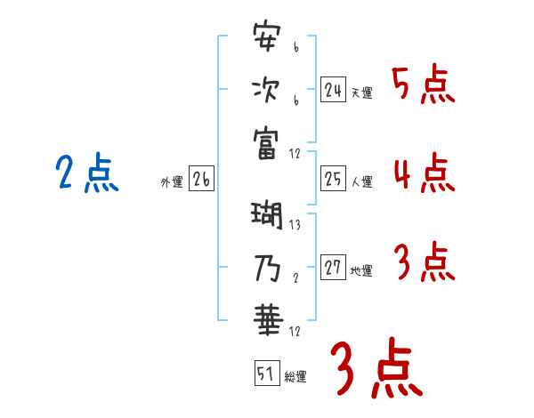 天運![]() | 安次富瑚乃華さんの天運は24画の5つ星!家庭運が良く順調な人生。金運にも恵まれる。 家系が持つ宿命的な運勢を表します。祖先から受け継いだ苗字ですので自分の力が及びません。家柄を象徴します。 |