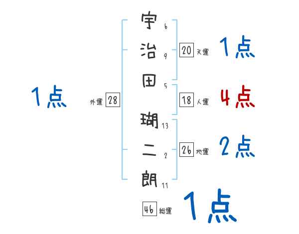 総運![]() | 宇治田瑚二朗さんの総運は46画の1つ星!迷走することが多く苦労するかも。目先のことにとらわれないように。 あなたの人生を表す1番重要な運勢です。生涯を通じて影響する総合運となり、主に50歳以降の晩年期に影響を及ぼします。 |