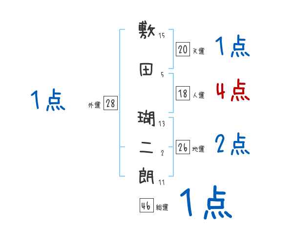 敷田瑚二朗さんの画数の鑑定結果