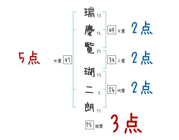 瑞慶覧瑚二朗さんの総運は75画の3つ星