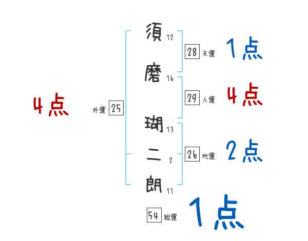 天運![]() | 須磨瑚二朗さんの天運は28画の1つ星!家庭環境に注意。スポーツで活躍できる能力があるかも。 家系が持つ宿命的な運勢を表します。祖先から受け継いだ苗字ですので自分の力が及びません。家柄を象徴します。 |