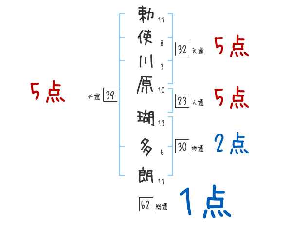 天運![]() | 勅使川原瑚多朗さんの天運は32画の5つ星!柔軟性があり成功する。チャンスが多く金運が良い。 家系が持つ宿命的な運勢を表します。祖先から受け継いだ苗字ですので自分の力が及びません。家柄を象徴します。 |